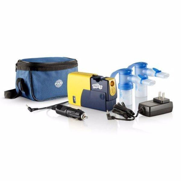 All configurations include a Pari Trek S Reusable Nebulizer and backup nebulizer, Trek® S Compressor, Wing-Tip® tubing, AC Adapter, 12V DC Adapter, Timestrip®, Instructional and Deluxe Carrying Case. Deluxe includes Li-Ion rechargeable battery.